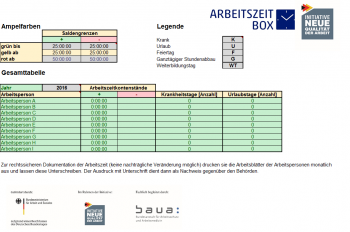 Achtung: Bei der Nutzung müssen die Datenschutzbestimmungen eingehalten werden. So dürfen z. B. die Beschäftigten keine Einsicht in die Arbeitszeitkonten der Kolleginnen/Kollegen erhalten. Hier kann mit einem Passwortschutz gearbeitet werden oder die Tabelle wird zentral von einer Person gepflegt.